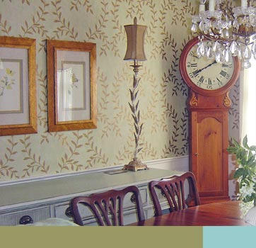 Working with an organic patterned wallpaper, Mary Ellen McKee-Curtis echoes the curving lines of the dining room's interior with a sepentine flora lamp and a grandfather clock with decorative carved motifs. Elegant gold framed prints contrast the organic wall finish and the dark, cherry chairs complement the lighter colored furnishings. |