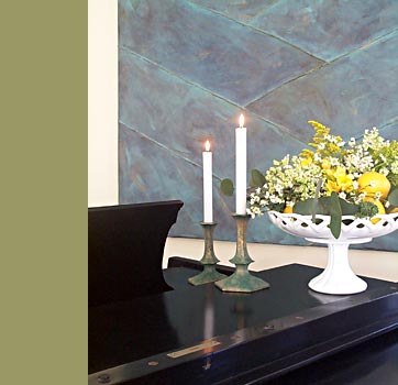 Soft light, whether it is cast by the light of day or candle tapers, can establish a mood like no other kind of light. Mary Ellen McKee-Curtis arranged this centerpiece, paired with lit candles, to dress up this musical setting. It can also be appreciated for its own natural beauty. The richly textured centerpiece, studded with flowers and fruit, provides an interesting interior accent against the contemporary backdrop of the room's decor. |